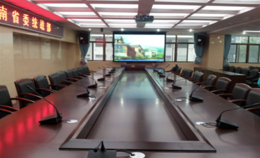 湖南省省委统战部,主要应用与召开统战部日常会议,接待会议等。此次采用松下6000流明工程投影机配合120寸dnp Supernova Winflex强光电动幕(Supernova Winflex强光电动幕采用了能有效吸收环境光线的高对比度滤镜,在高亮度环境下提供明显改进的图像对比度,因此,即使在会议室和展厅等明亮照明环境下,都能显示清晰生动的图像。)